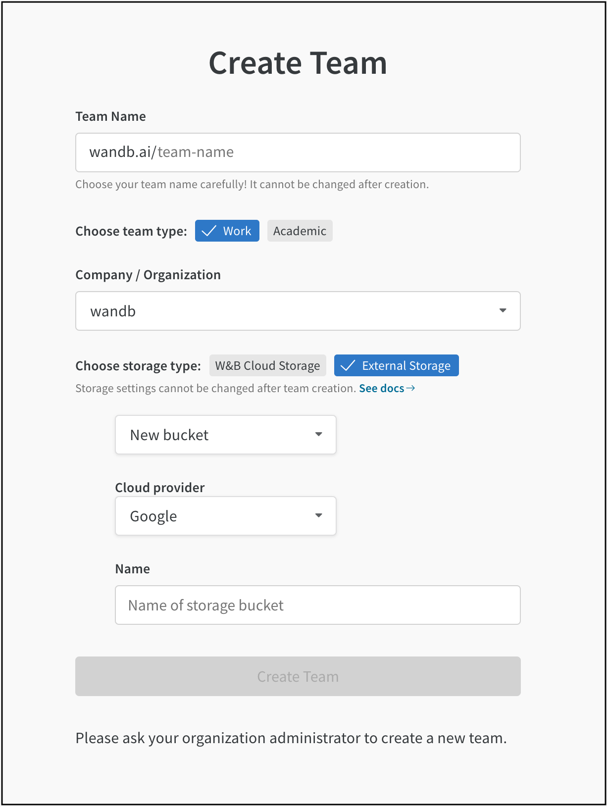 GORILLA_SUPPORTED_FILE_STORES 環境変数を使用してストレージバケットを指定し、それをチーム用に設定する前に以下の手順に従ってください。W&B チーム作成時にチームレベルでストレージバケットを設定するには: