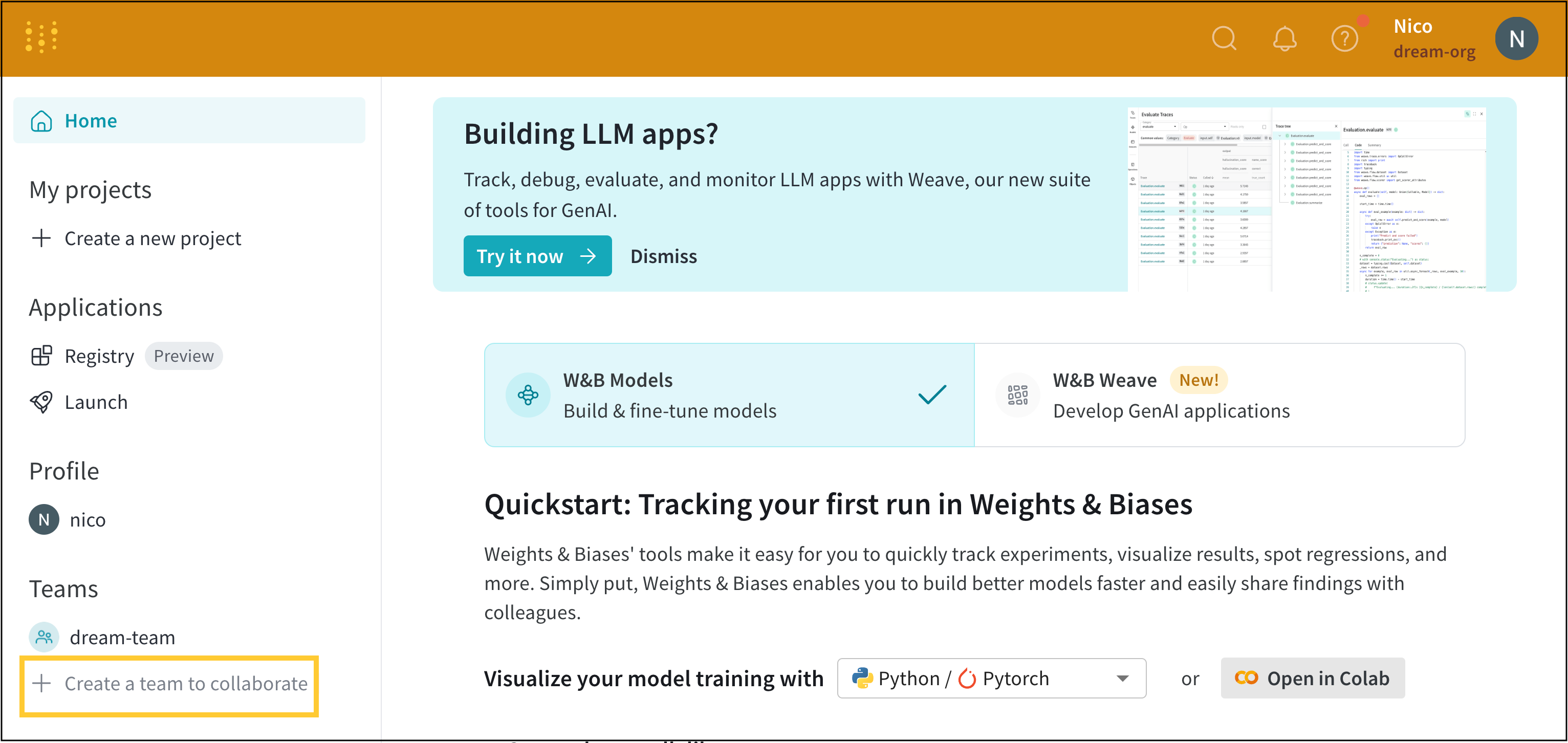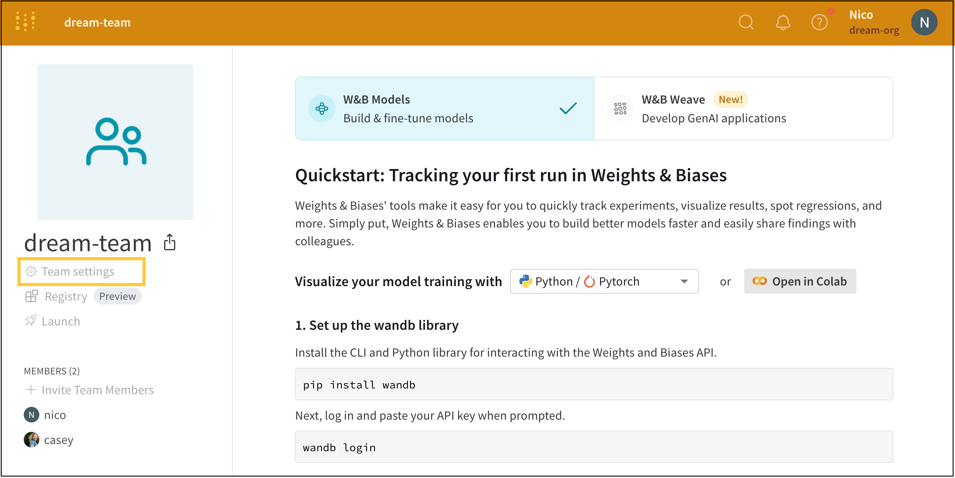 チームを作成 ボタンを選択すると、W&Bは https://wandb.ai/<team-name> の新しいチームページにリダイレクトします。<team-name> はチーム作成時に入力した名前を使用します。